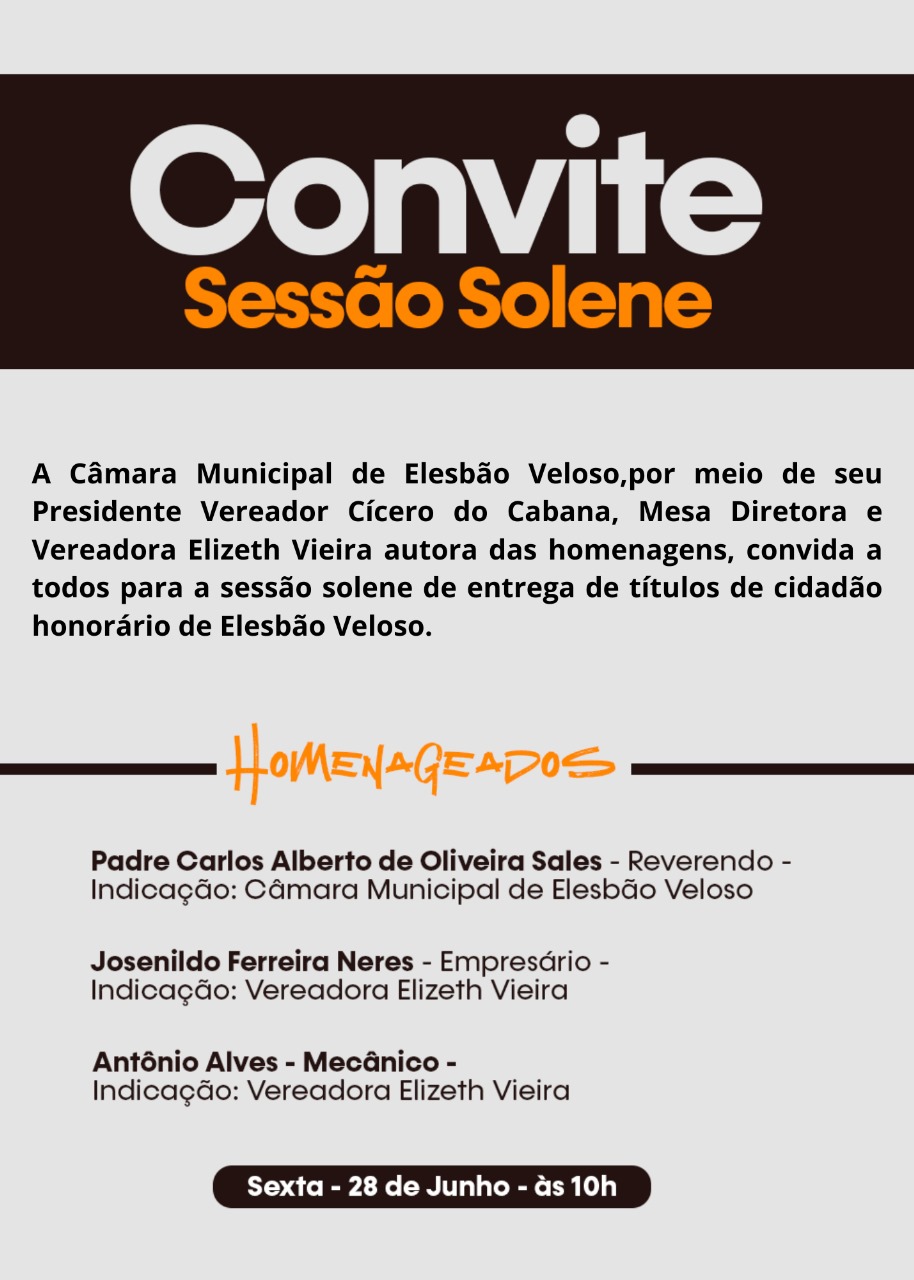 Data: 28/06/2024A Câmara Municipal de Elesbão Veloso, por meio de seu presidente vereador Cícero Marcos de Oliveira (Cícero do Cabana), Mesa Diretora, Vereadora Elizeth Vieira, autora das homenagens e demais vereadores, convida a toda população para prestigiar a Sessão Solene para entrega de Títulos de Cidadão Elesbonense às seguintes personalidades:
