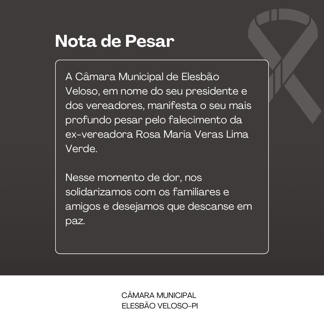 Data: 24/10/2024“É com profundo pesar que recebemos a notícia do falecimento da ex-vereadora Rosa Maria Verás Lima Verde e estendemos nossas condolências aos familiares e amigos”.