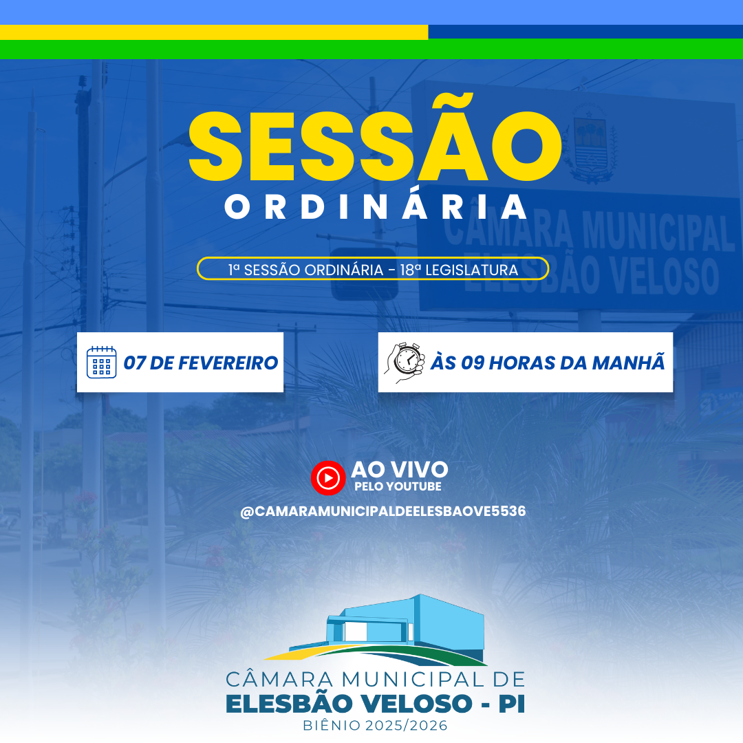 A Câmara Municipal de Elesbão Veloso (CMEV) realizará a 1ª sessão ordinária do ano, no dia 7 de fevereiro, no Palácio Legislativo Ver. Luís de Castro Barbosa, na Avenida Benício Alves - Centro.